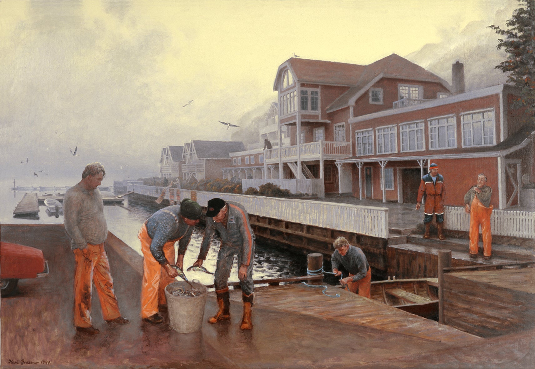 Fiskere i regntøy på brygga i Korshamn.