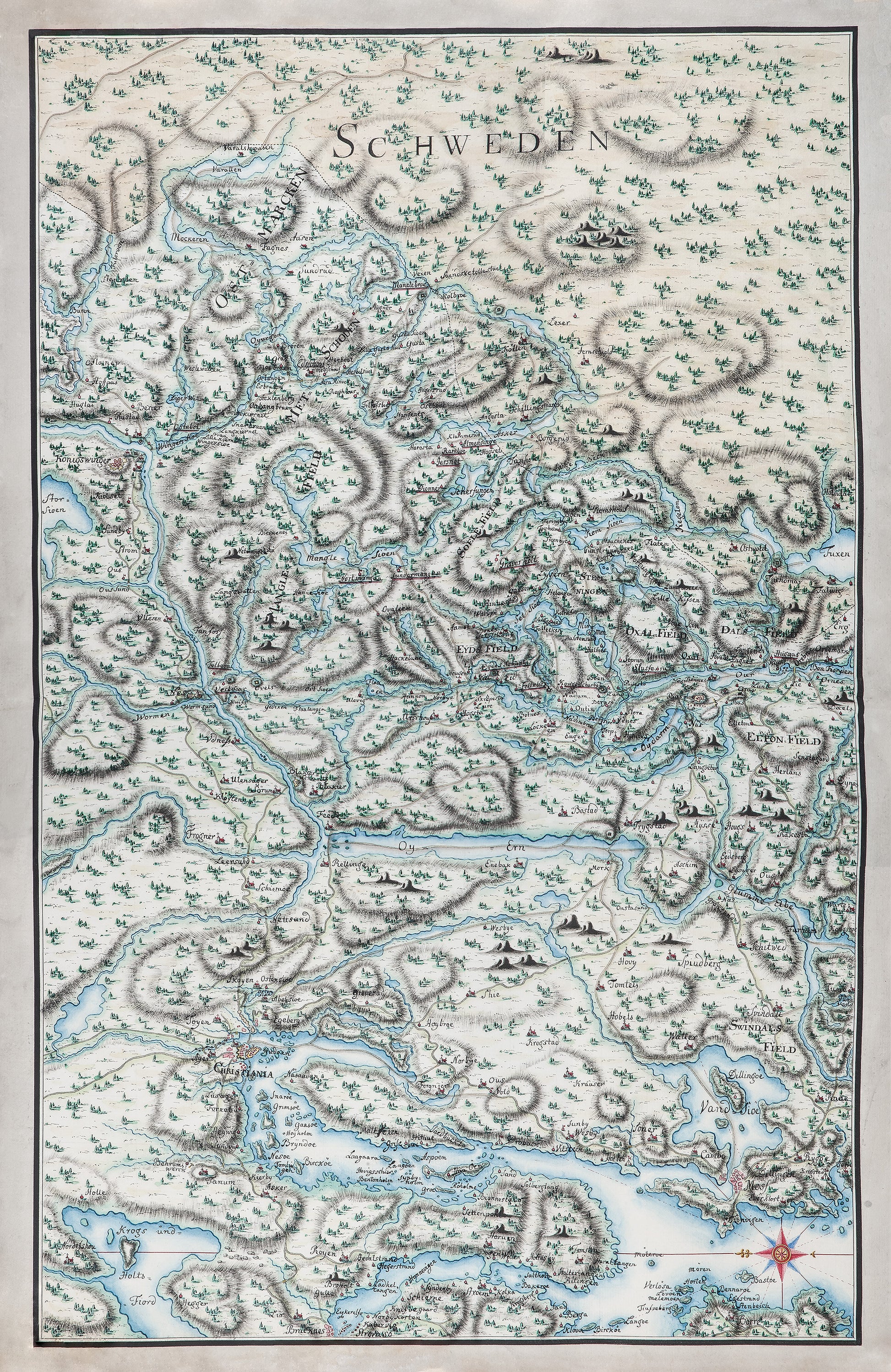 Kart antagelig fra 1600 tallet, Østlandet sett vestfra.